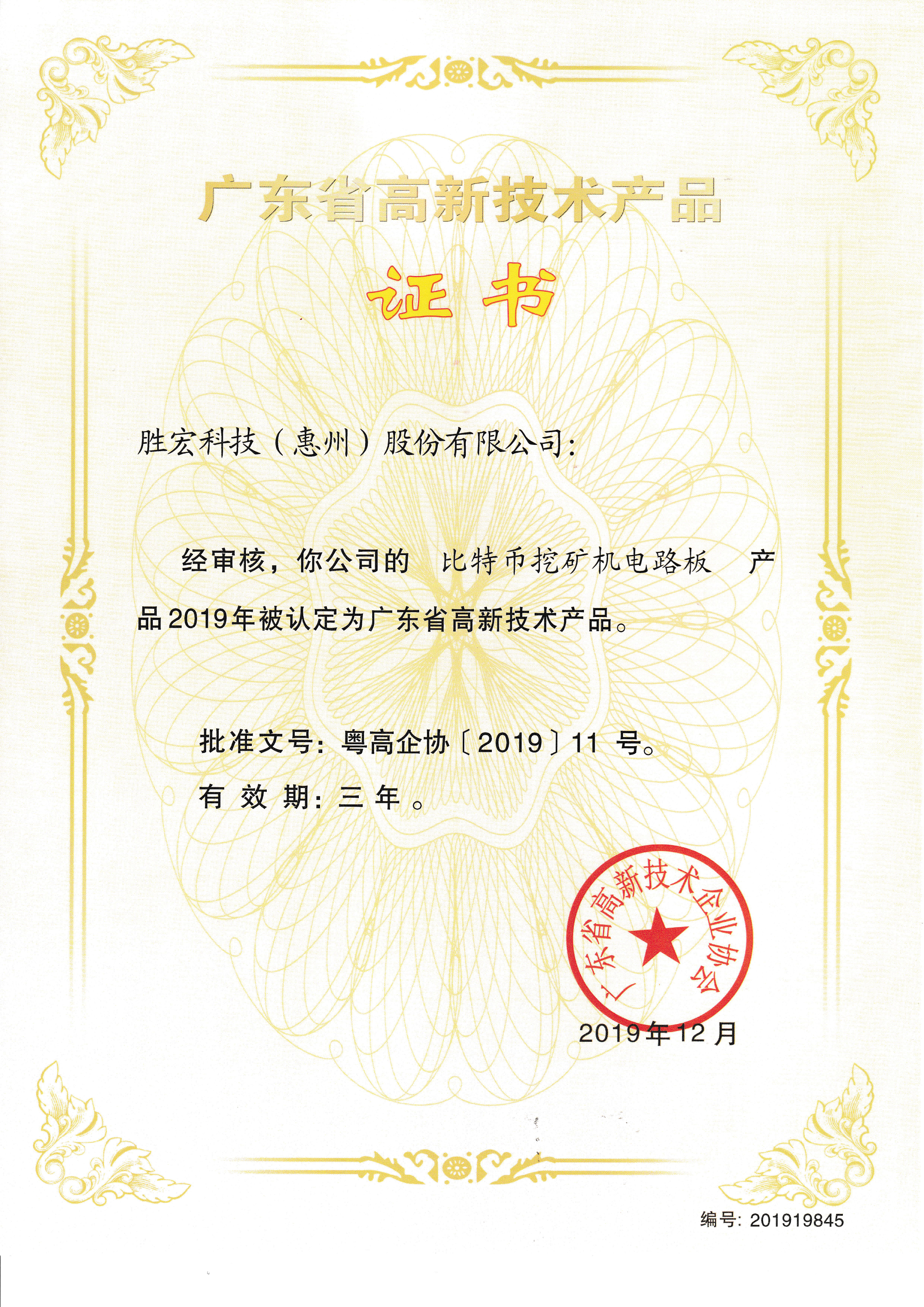 “比特幣挖礦機電電路板”高新技術(shù)產(chǎn)品證書