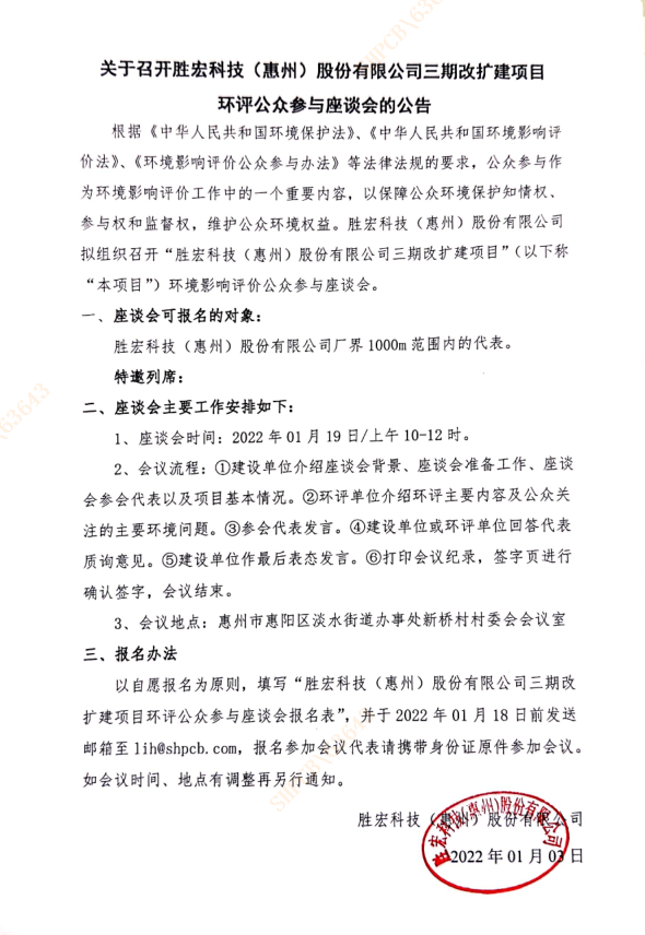 關(guān)于召開勝宏科技(惠州)股份有限公司三期改擴建項目環(huán)評公眾參與座談會的公告